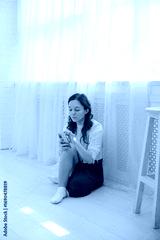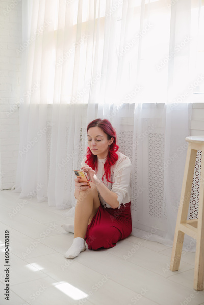 Young woman with red hair sitting on a bright white floor, engrossed in her smartphone. A modern casual scene depicting digital connectivity, online interaction, and home leisure with natural light.
