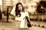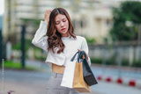 Confused Asian Woman Searching Through Shopping Bags in Urban Setting