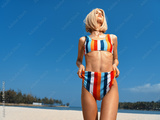 young woman in colorful striped bikini standing on sunny beach, looking up with confident expression, clear blue sky and sand in background, summer lifestyle