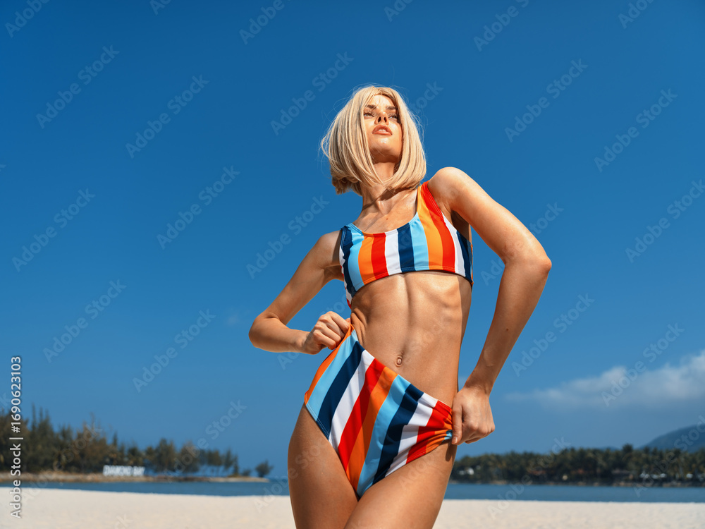 confident young woman wearing colorful striped bikini standing on sunny beach, posing with hands on hips, clear blue sky and distant trees in background