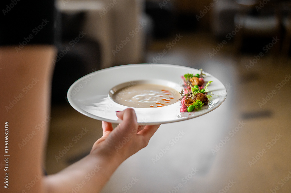 Elegant gourmet dish served on a white plate, featuring creamy sauce with red oil drops and artfully arranged appetizers, captured in a fine dining setting with shallow depth of field.
