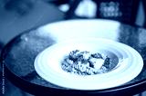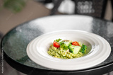 Plate of rotini pasta with green pesto sauce, cherry tomatoes, mozzarella, parsley, and microgreens, served on a white dish in a restaurant setting