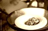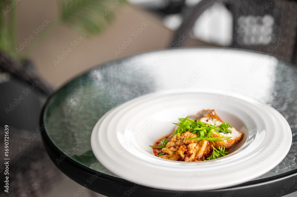 Gourmet dish with herbs and toasted bread served on a white plate at an outdoor restaurant table. Elegant food presentation in natural light with patio ambiance