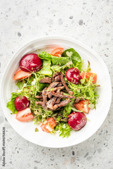 Fresh salad with grilled beef strips, arugula, romaine lettuce, tomatoes, and whole red beets served on a white plate. Healthy, colorful, and balanced meal presentation