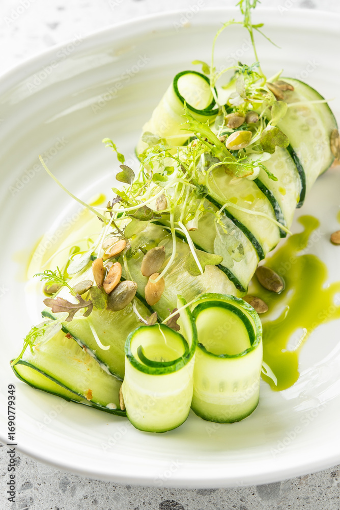 Elegant cucumber salad with microgreens, seeds, and herb oil dressing, artistically plated on white ceramic, ideal for fine dining, healthy eating, and gourmet presentation themes