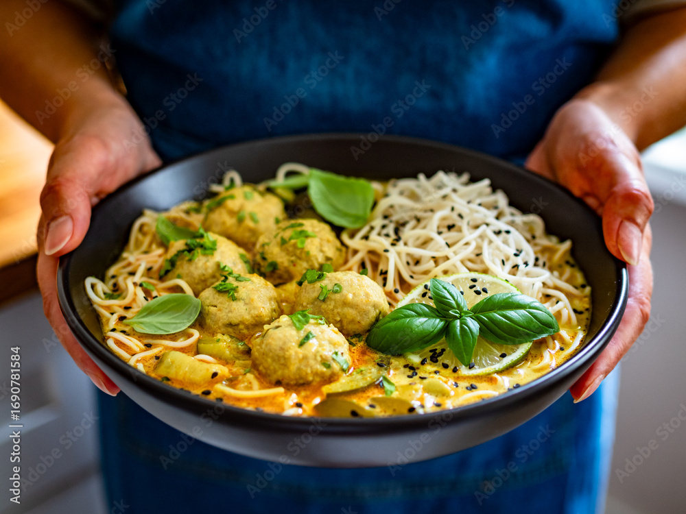 Woman holding plate with curry soup with meatballs and zucchini with Asian noodles, close-up