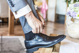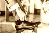 Bräutigam auf Hochzeit bindet sich die Schuhe, Detail