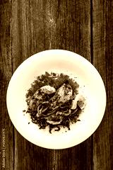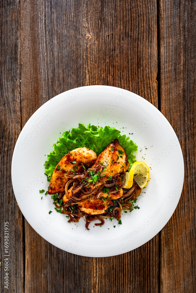Fried pieces of chicken breast with caramelized onion on wooden table