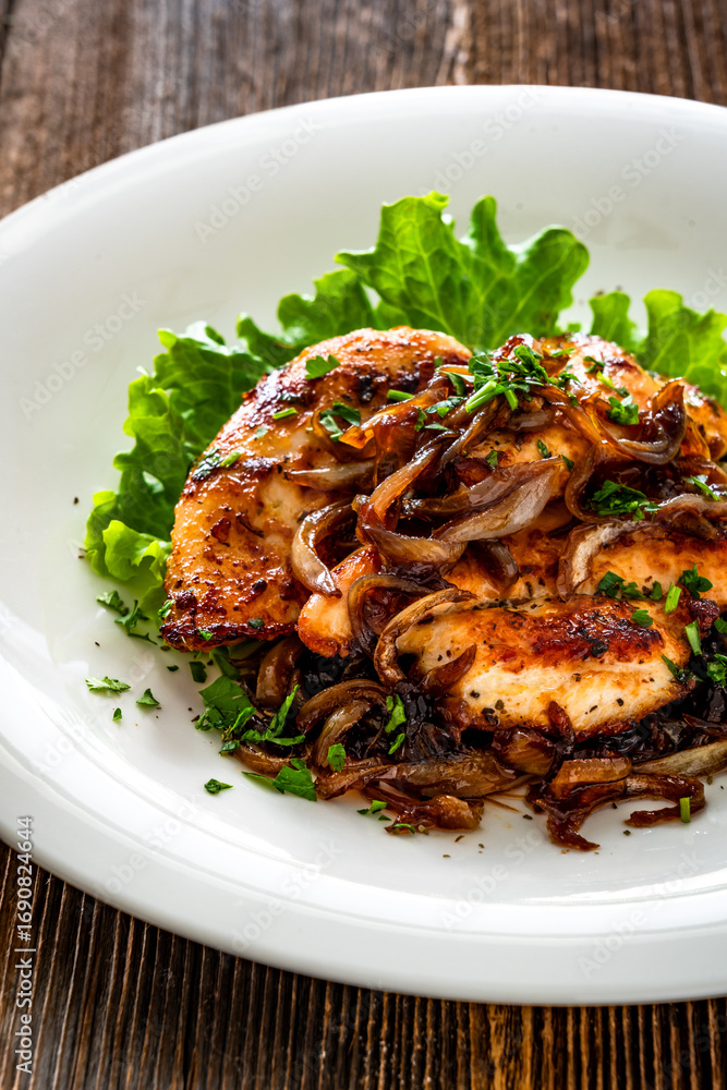 Fried pieces of chicken breast with caramelized onion on wooden table