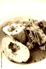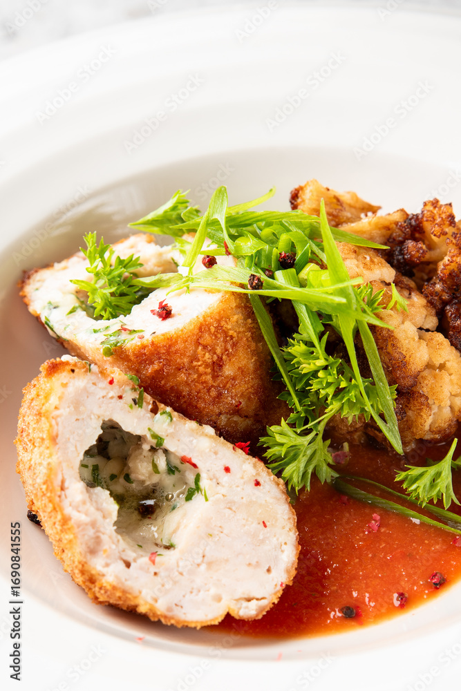 Gourmet plated dish with stuffed chicken breast, roasted cauliflower, red peppercorn sauce, and parsley garnish. Elegant food styling on white textured plate