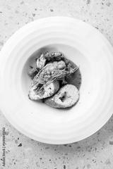 Gourmet plated dish with stuffed chicken breast, roasted cauliflower, red peppercorn sauce, and parsley garnish. Elegant food styling on white textured plate