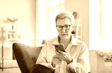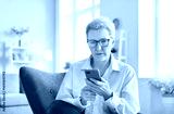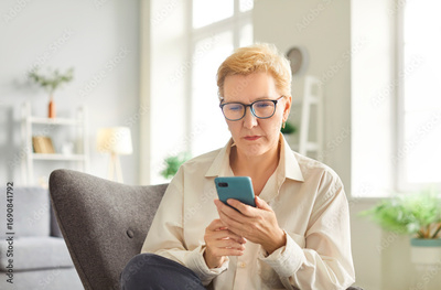 Senior woman in glasses sitting in cozy armchair and using smartphone in living room. Mature lady focusing on screen, browsing or texting, enjoying modern technology in comfortable home environment.