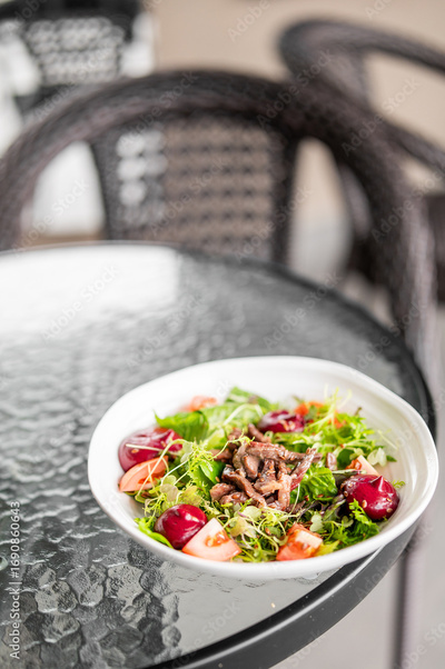 Fresh salad with leafy greens, tomatoes, beets, and grilled beef served in a white bowl on a glass table in an outdoor dining setting. Vibrant, healthy, and appetizing meal