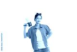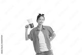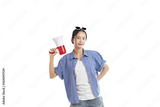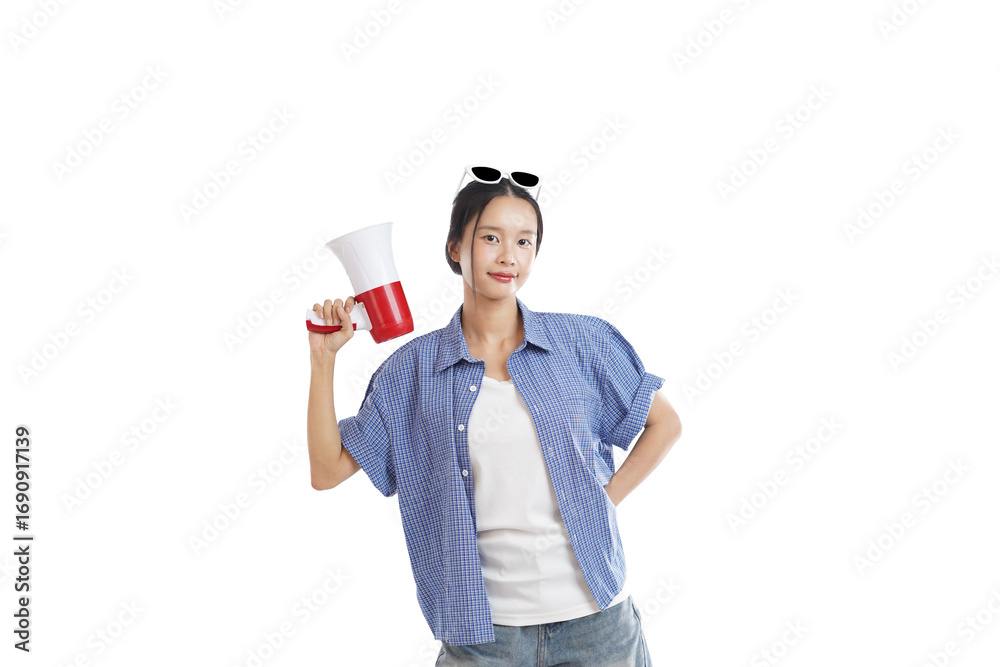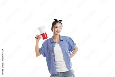 Young Woman Holding a Megaphone: A confident young woman holding a megaphone, radiating empowerment, wearing a blue shirt and sunglasses. Ideal for marketing, advertising, and communication.
