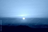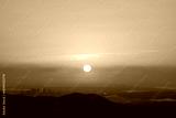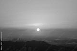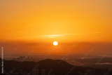 The sun rises brightly in the sky above the misty mountains and distant city.