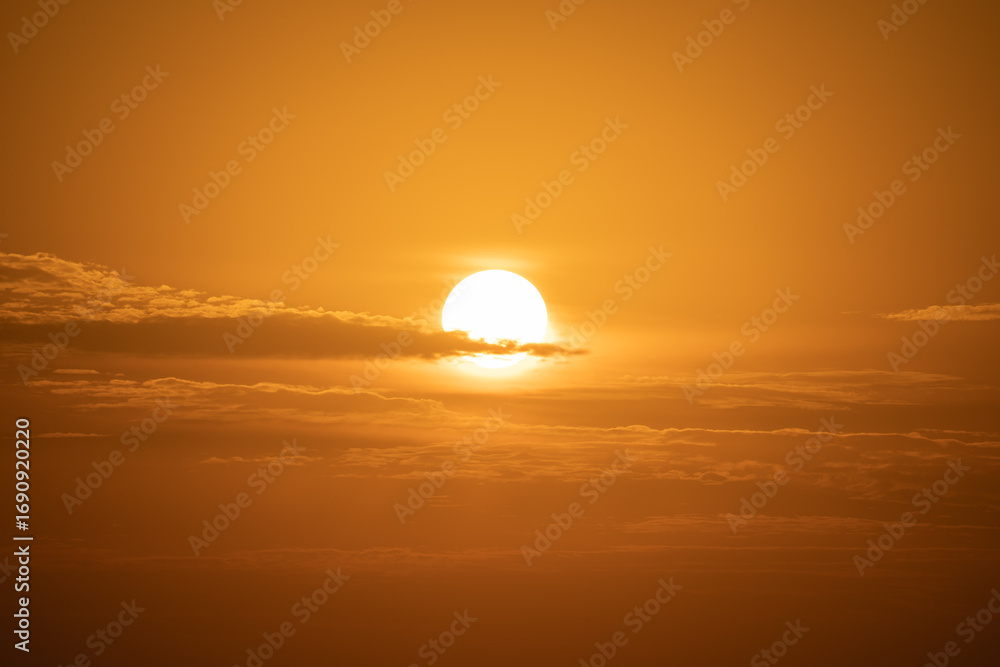The bright sun shines through soft clouds in the warm sky, creating a beautiful light.