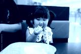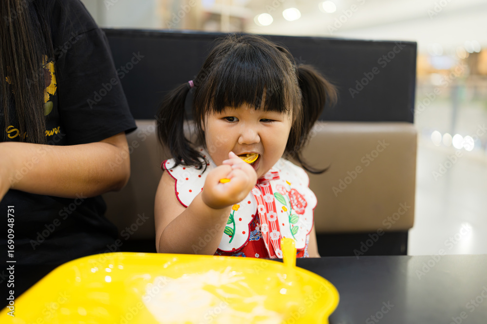 A cute little Asian girl is happily eating at a dining table in a restaurant,A young, cute and cheerful Asian girl is enjoying breakfast at the dining table.