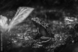 A vibrant blue poison dart frog with black spots rests on moist ground, surrounded by tropical foliage and dim forest light.