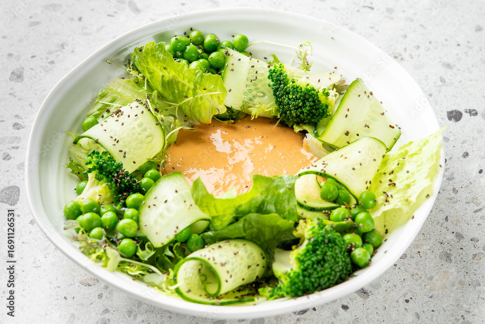 Fresh green salad with lettuce, broccoli, peas, cucumber ribbons, chia seeds, and creamy dressing in a white bowl. Healthy vegan food, top view