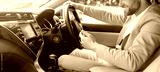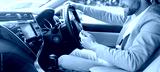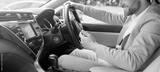 Navigation system. Side view of happy handsome businessman using smartphone while sitting in automobile. Rent and trade-in. Young european man in suit is driving in city and looking at gps map