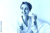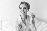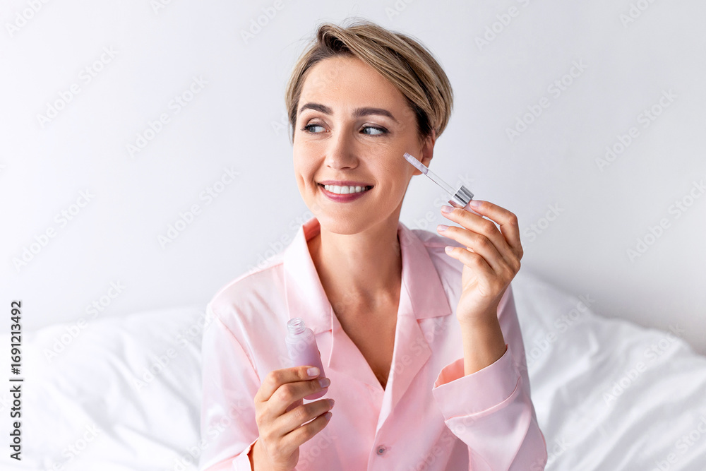 Facial Skincare. Happy Woman Applying Essential Serum With Dropper Under Eye, Moisturizing Skin Sitting In Bed At Home, Free Copy Space. Domestic Skin Care Routine Concept. Beauty And Cosmetics