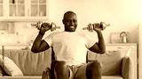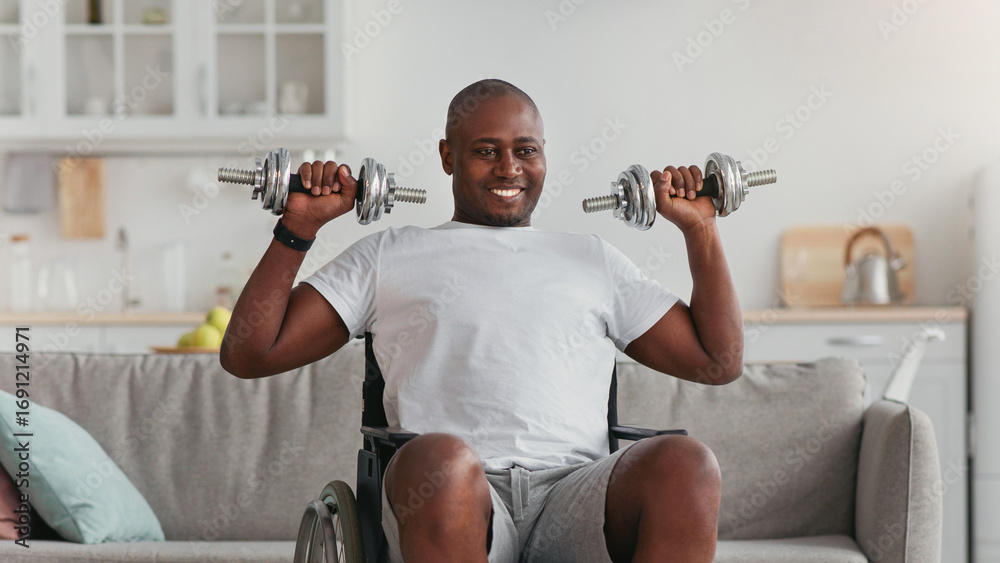 Physical activities for disabled people. Handicapped black man in wheelchair make rehabilitation exercises with dumbbells at home. Impaired guy working out with weights indoors, raises dumbbells