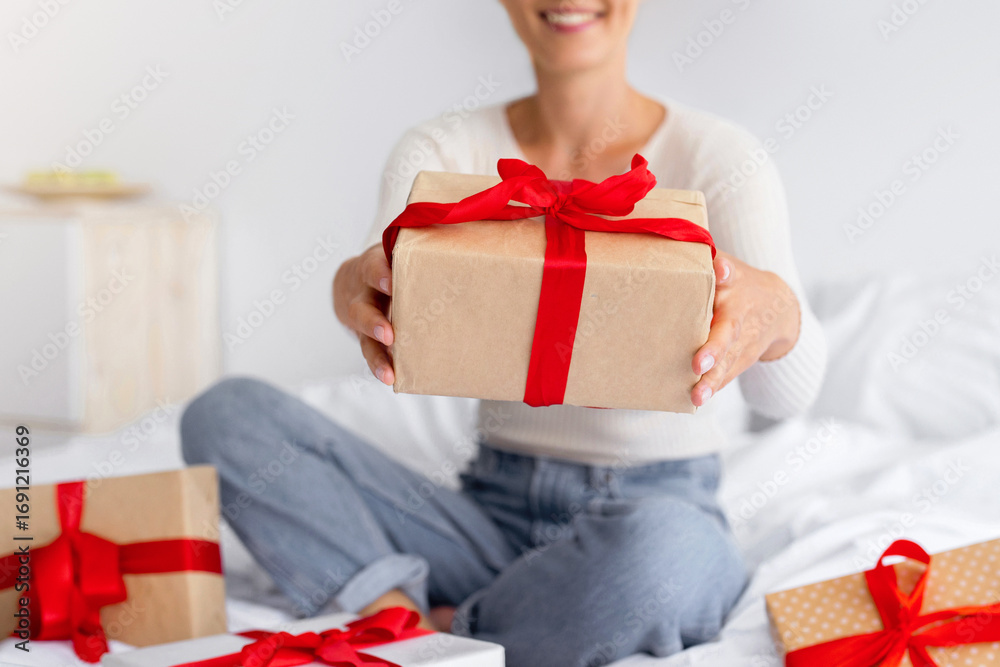Xmas Celebration. Closeup cropped of unrecognizable casual lady holding present box in hands, giving it to camera. Selective focus on Christmas gift wrapped in craft paper with red bow ribbon, banner