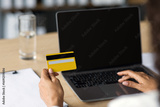 Great offer, black friday, quick purchase, pay of financial bills and modern tech. Young black lady sits at table and typing on laptop with empty screen and show credit card, close up, pov, cropped