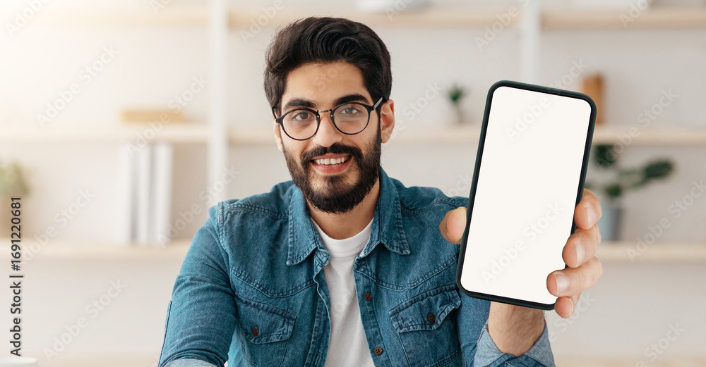 Hello. Happy arab man waving hand and smiling to camera, sitting at workplace at home. Eastern guy gesturing hi and greeting while making video call. Modern remote communication concept