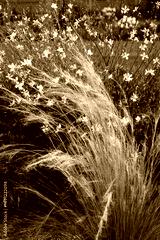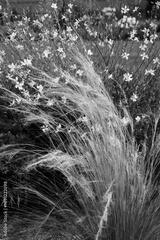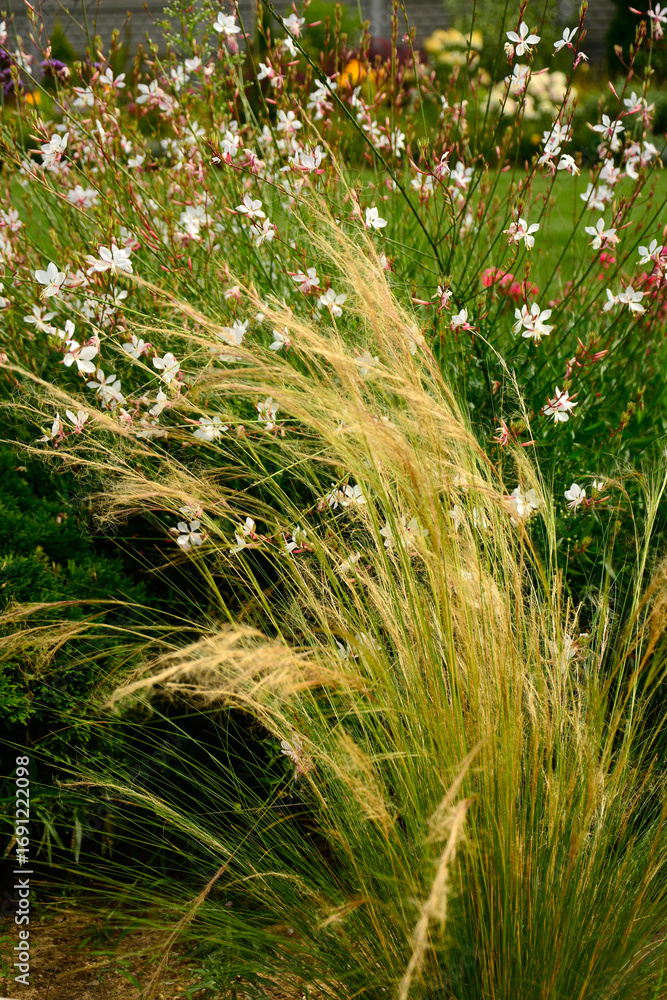 włosowate kwiatostany ostnicy cieniutkiej i Gaura Lindheimera, Gaura lindheimeri, Stipa tenuissima, flowering stipa, known as feather grass, needlegrass, spear grass in the steppe