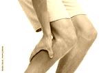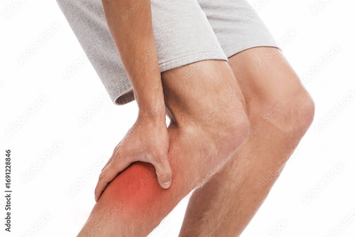 Cropped young caucasian male suffering from muscle pain and pressing hands to leg, isolated on white background, copy space. Sports injury and trauma, spasm and sprain. Health and body care concept