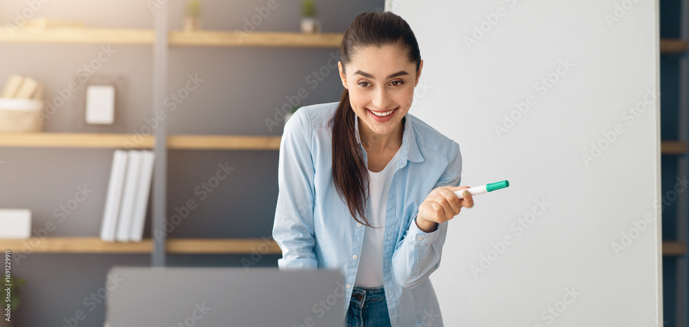 Gadgets for online education, self-isolation at home during covid-19 lockdown. Happy cute young arabian female teacher points at board, looks at smartphone webcam at table with laptop at home interior