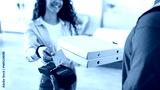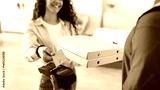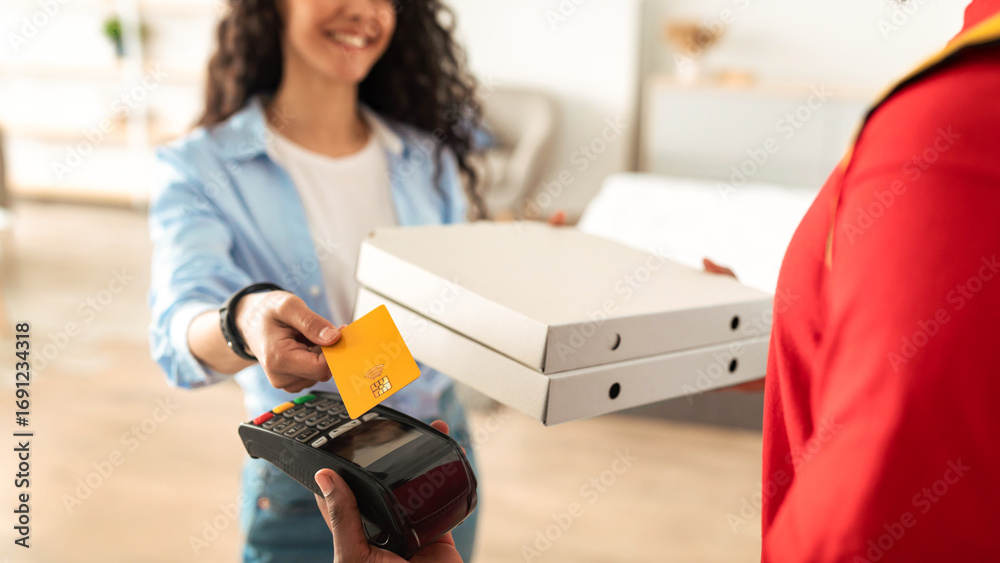 Delivery And Technology. Smiling woman using credit card for contactless payment, black male courier in red uniform holding POS machine in hand and pizza boxes to happy customer, selective focus