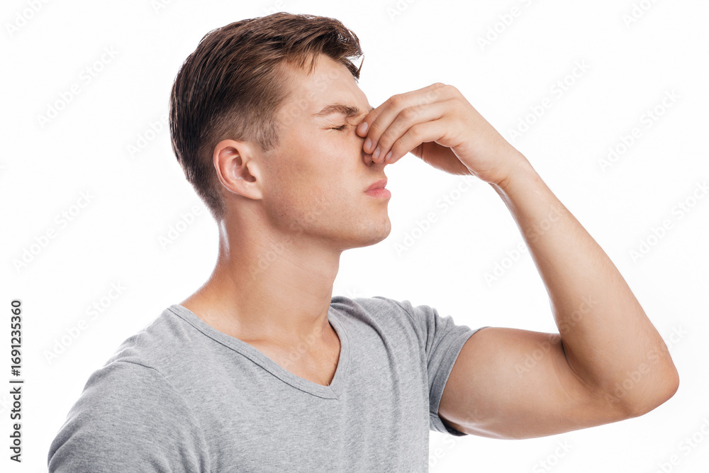 Sad millennial caucasian attractive guy presses hand to nose, suffers from pain after injury, bleeding and headache, isolated on white background, profile. Runny nose, trauma and health problems