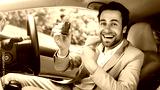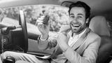 New car, rent transport, buying auto, positive emotions of buyer, good ad and great offer. Happy excited millennial caucasian male in suit showing keys, sits on seat in cabin automobile, free space