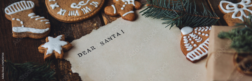 Banner. Christmas written letter with wish list with Dear Santa text. Xmas December tradition for kids and adults, cozy home decor, homemade gingerbread cookies, new year decoration, wooden background