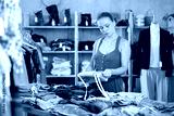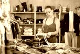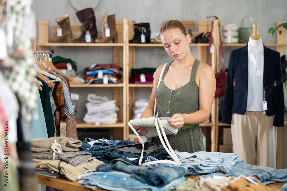 Young woman carefully examines a handbag in a store before buying. Thrifty buyer calculates the budget for the purchase of bags and accessories