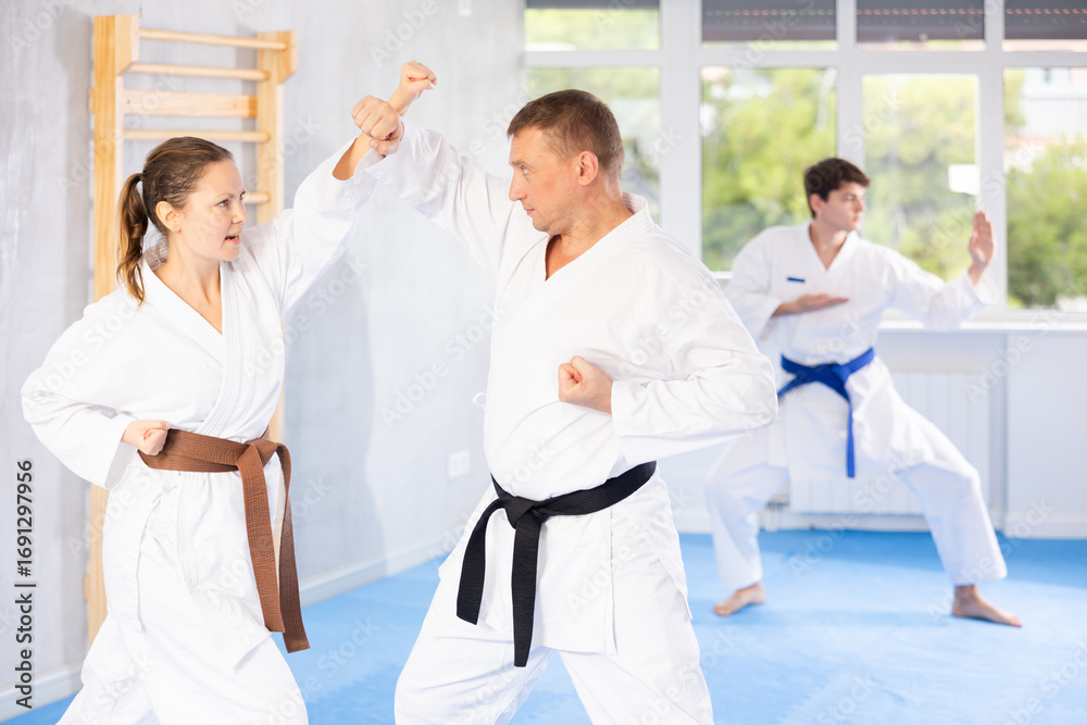 Woman and man in kimono sparring together in gym during karate training