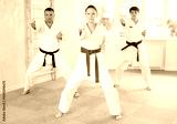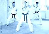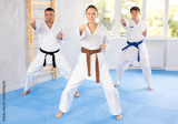 Three athletes have taken starting position and studying and repeating sequence of punches and painful techniques in karate kata technique. Oriental martial arts, training and obtaining black belt