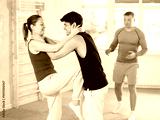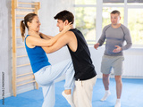 Young guy and woman train to perform effective defense of strangling opponent, while learning self-defense techniques. Lesson in presence of experienced instructor