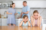 Frightened and frowning children sit at kitchen table during mom and dad quarrel. Behind children, parents swearing in background. Family conflict, divorce
