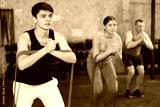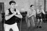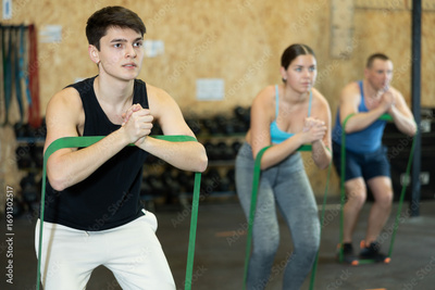 Young dedicated man doing exercises with stretch rope standing near other people in gym