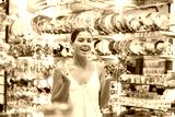 Woman peruses selection of souvenirs at shop in popular tourist destination. Tourist buyer with bull statuette in hands thought about it, makes purchase decision, remembers