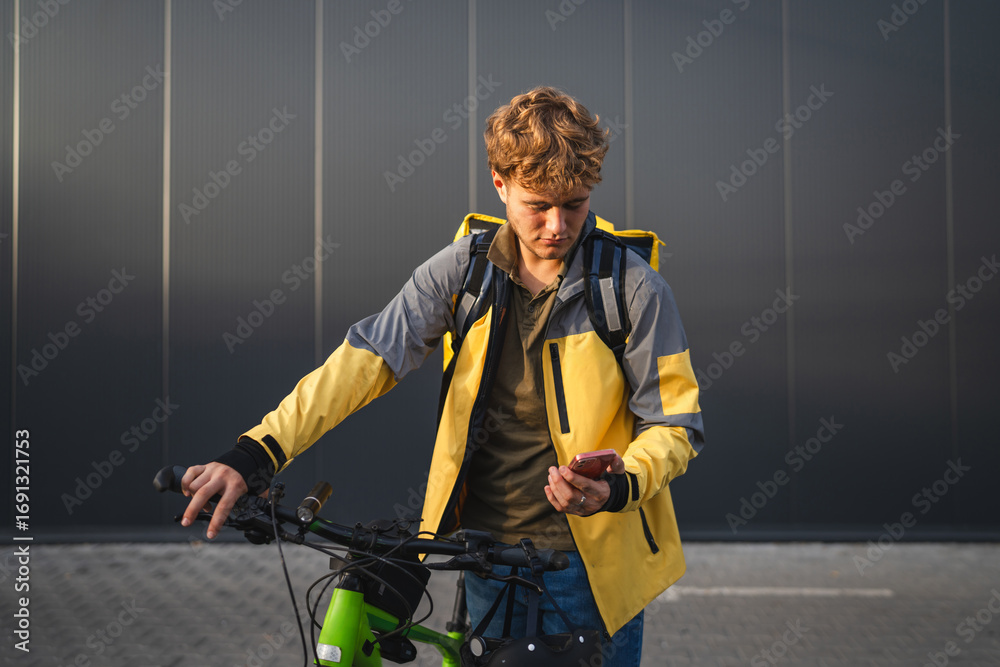 Deliveryman using smart phone app while holding his bicycle