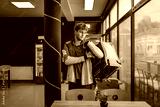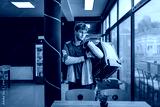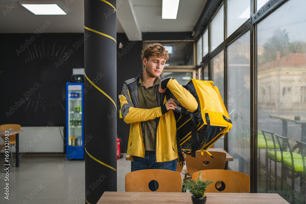 Deliveryman waiting with thermal backpack in restaurant for order pickup