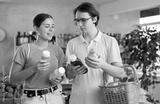 Couple young man and woman buyers choosing sauces in grocery store