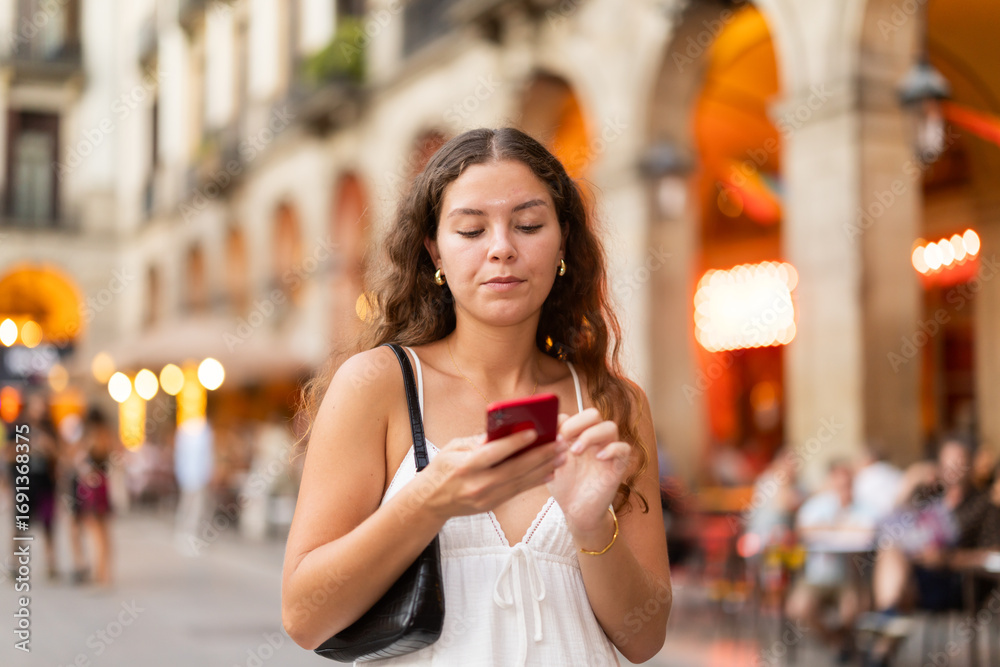 Young woman came on a date in the evening in Barcelona, she uses an online dating app. European woman looks at the address of a restaurant and bar on the Internet