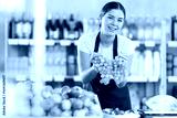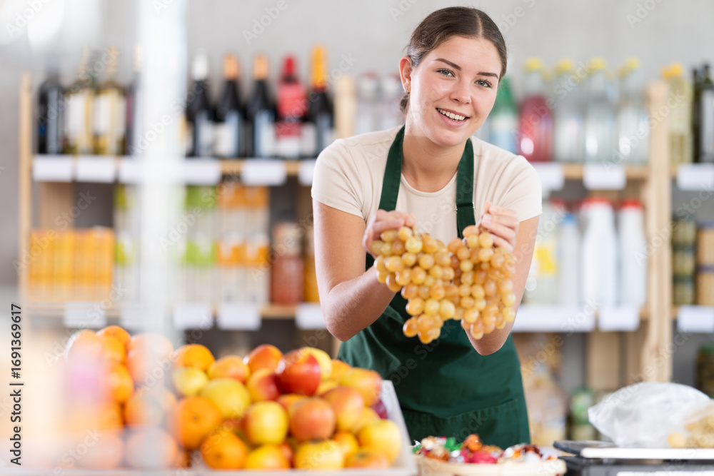 Young woman girl seller in store is standing near fruit berry counter, selling grape. She holds out of rape grape, weighs goods, serves invisible customer.