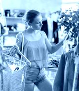 Girl chooses a set of clothes for the summer. Visitor to the boutique examines the new summer collection of clothes