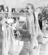 Happy teenage girl choosing something for summer in clothing shop with large assortment